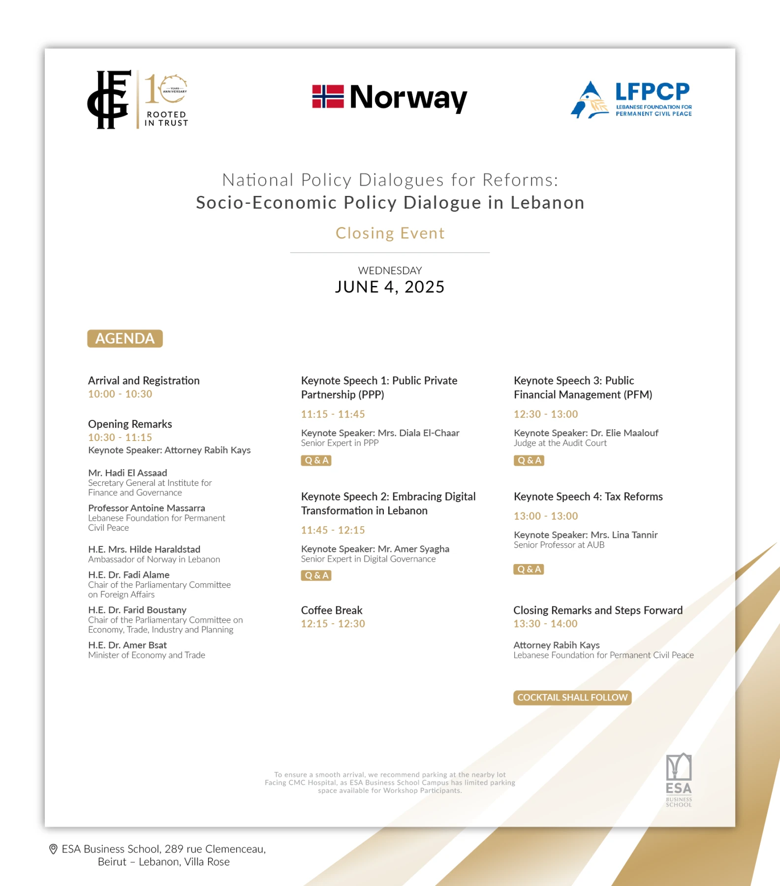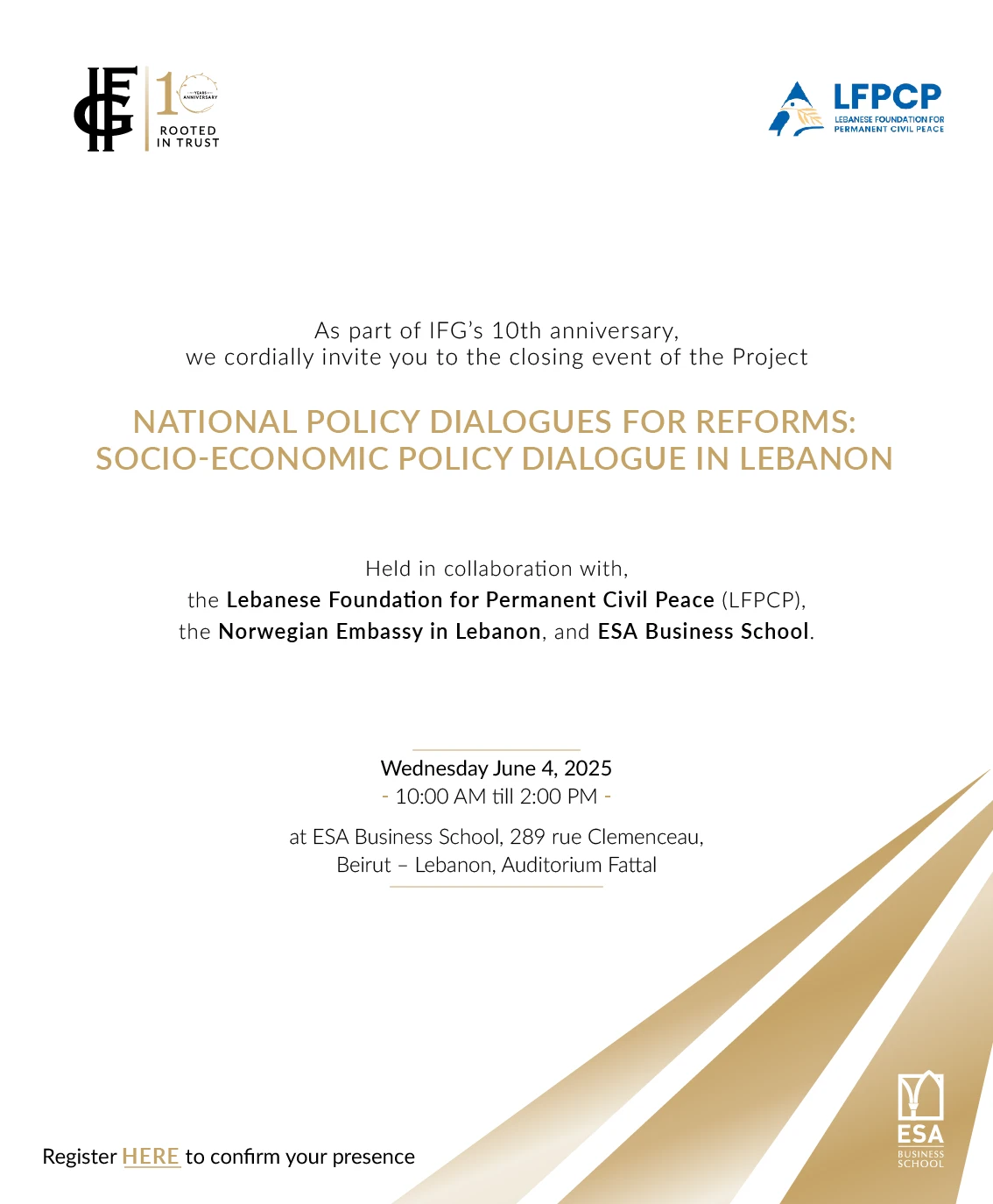 The Institute of Finance and Governance (IFG), in collaboration with the Lebanese Foundation for Permanent Civil Peace (LFPCP), the Norwegian Embassy in Lebanon, and ESA Business School, held the third event of the National Policy Dialogues for Reforms: Socio-Economic Policy Dialogue in Lebanon series on June 4, 2025.